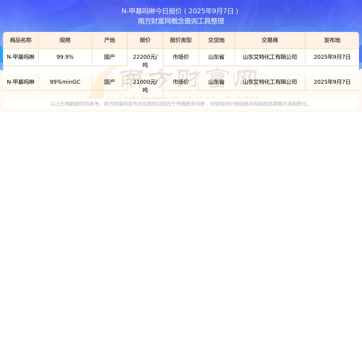 2025年9月7日,山東艾特化工有限公司N-甲基嗎啉(99%minGC),國產(chǎn),交易地點(diǎn)為山東省,報(bào)價(jià)為21000.00元/噸。