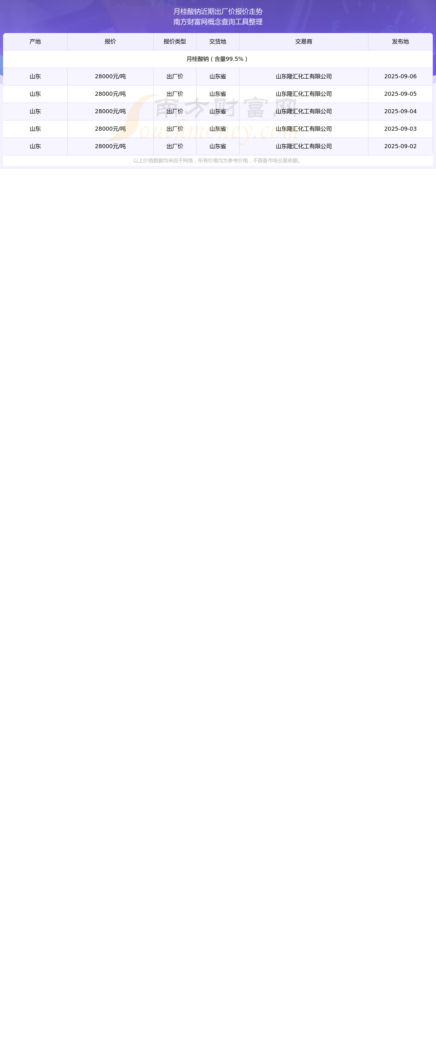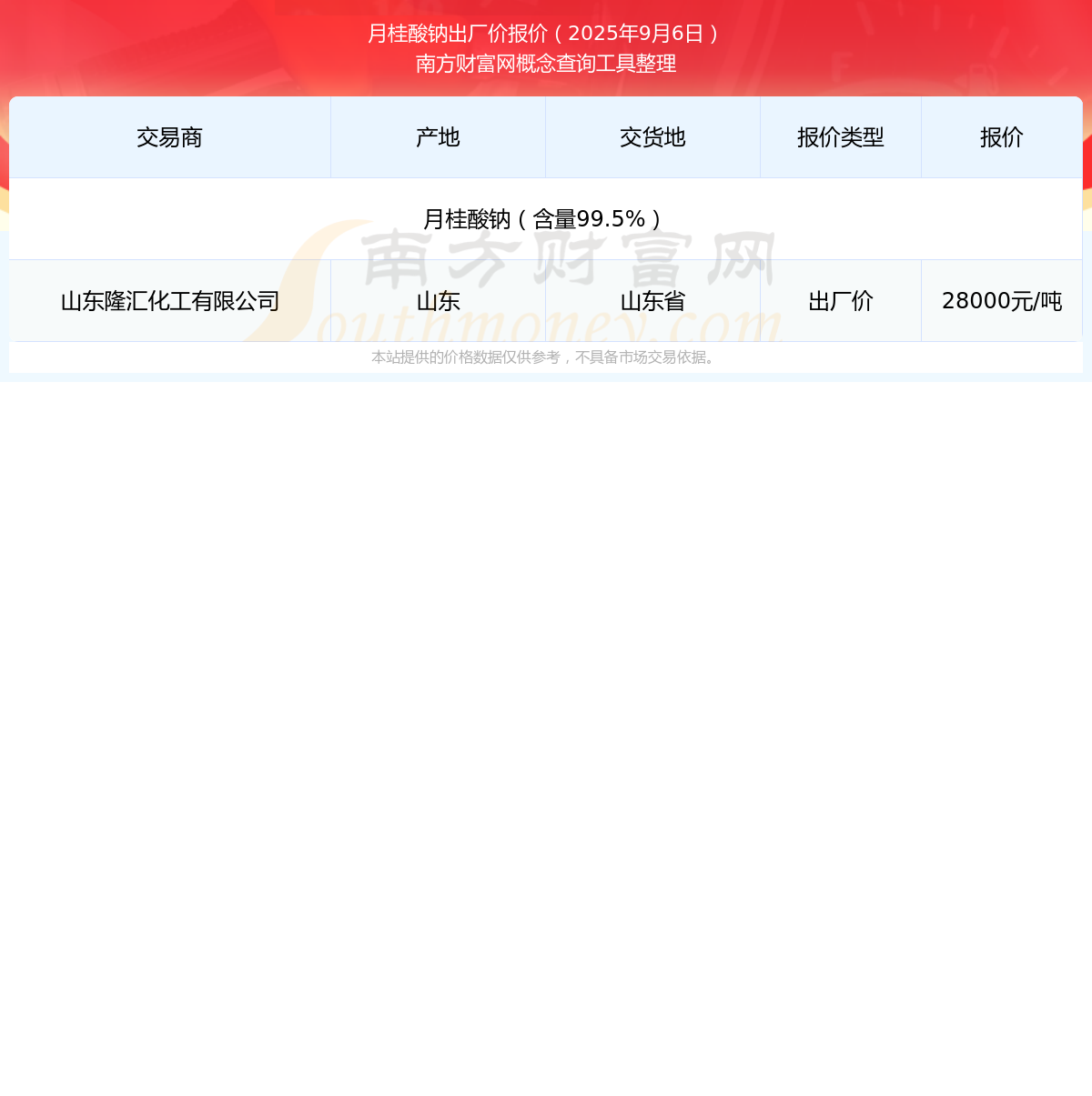 2025年9月6日,月桂酸鈉(含量99.5%)出廠價(jià)價(jià)格為28000.00元/噸,報(bào)價(jià)人:山東隆匯化工有限公司,交易地點(diǎn)為山東省。