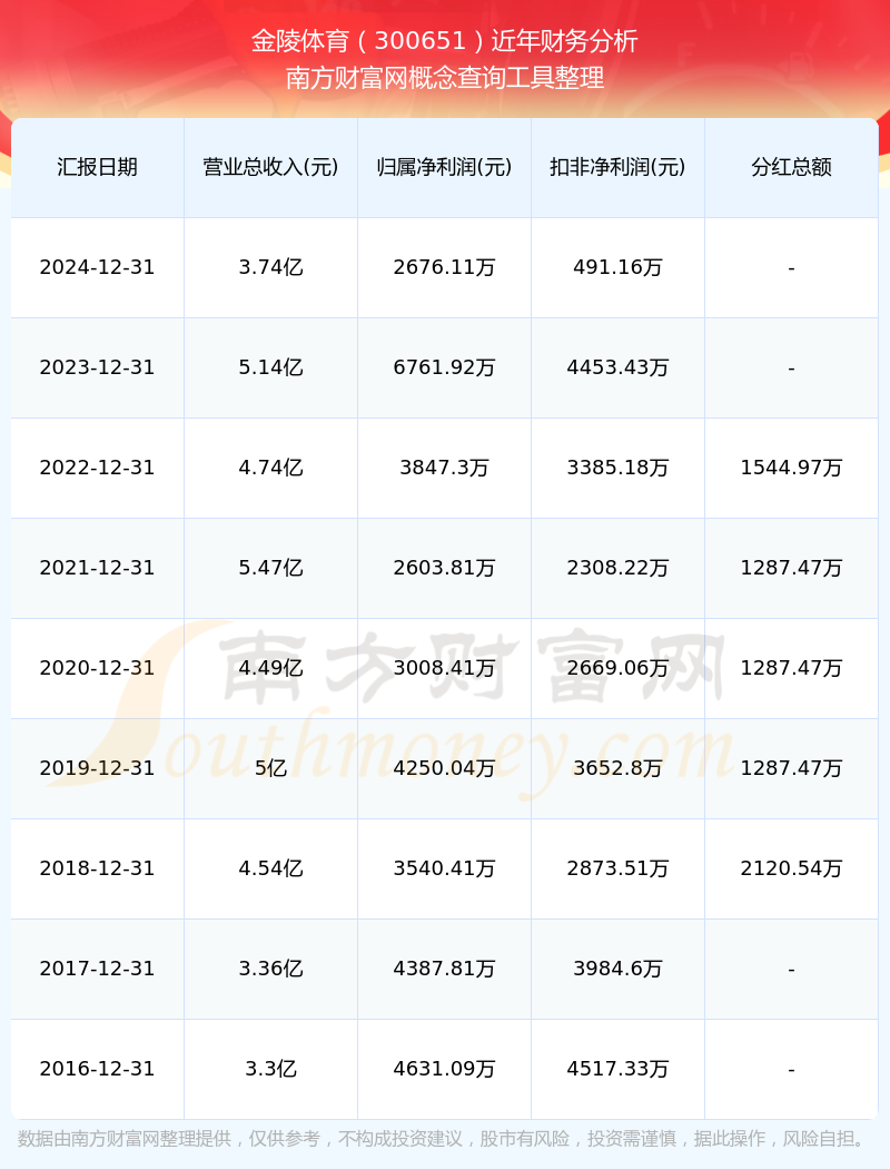 金陵體育公司2024年實(shí)現(xiàn)營(yíng)業(yè)收入3.74億元,同比增長(zhǎng)-27.3%;凈利潤(rùn)2676.11萬(wàn)元,同比增長(zhǎng)-60.42%;毛利率30.38%。