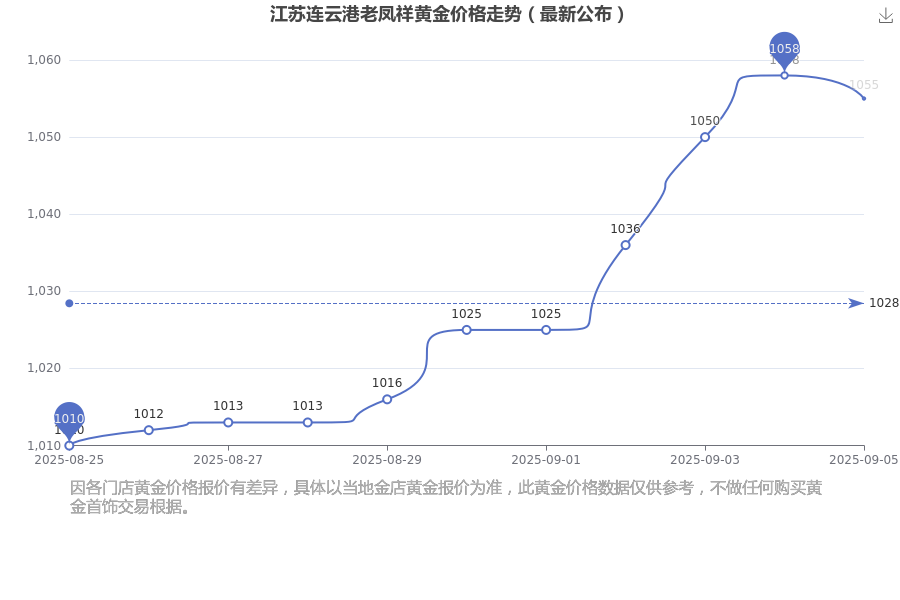 (2025年9月6日)江蘇連云港老鳳祥黃金價(jià)格現(xiàn)在為1055.0元/克。