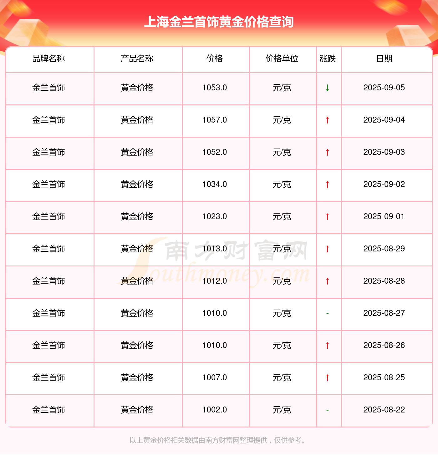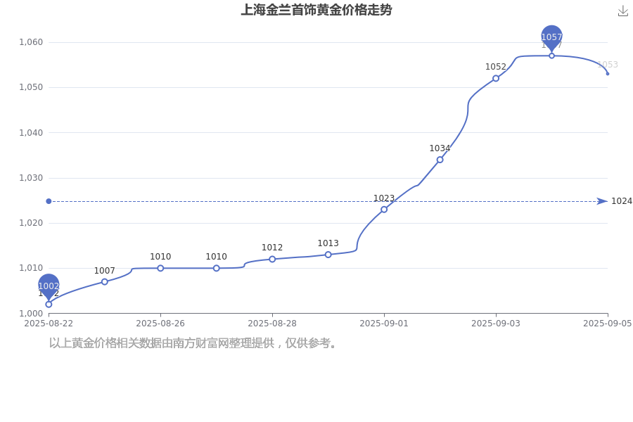 (2025年9月6日)上海金蘭首飾黃金價格現(xiàn)在為1053.0元/克。