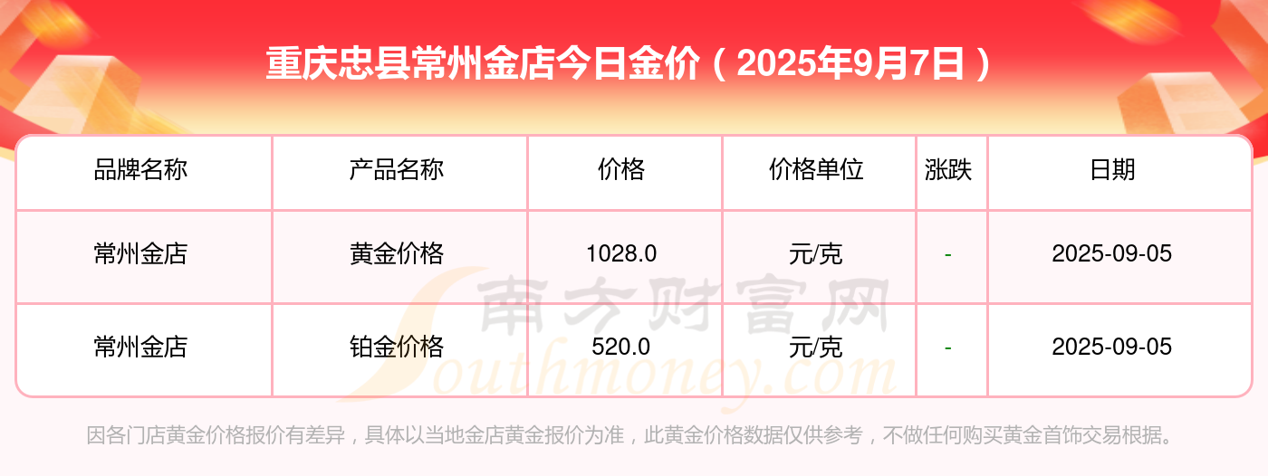 2025年9月7日重慶忠縣常州金店黃金價(jià)格查詢表來了(多少錢一克)