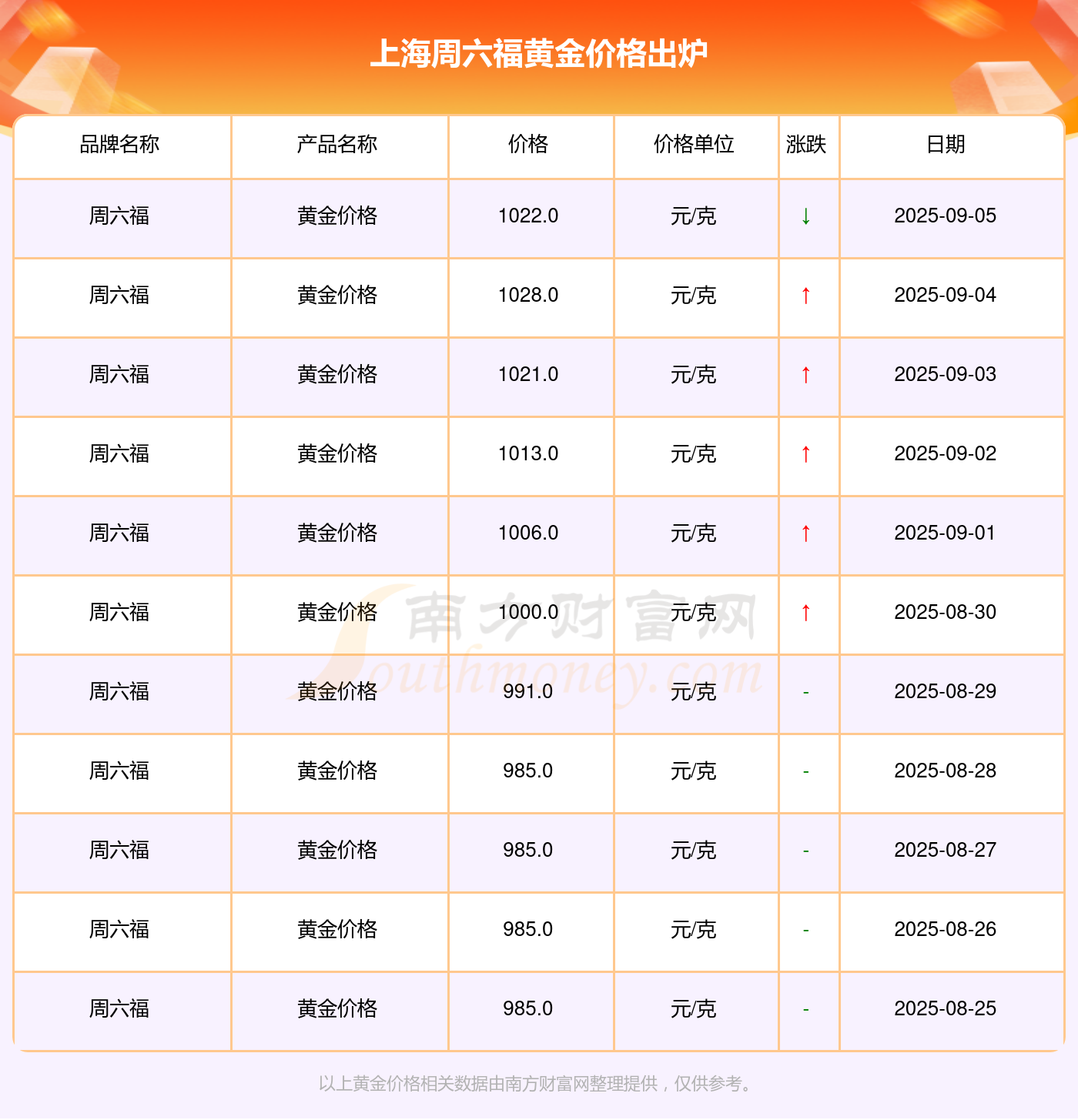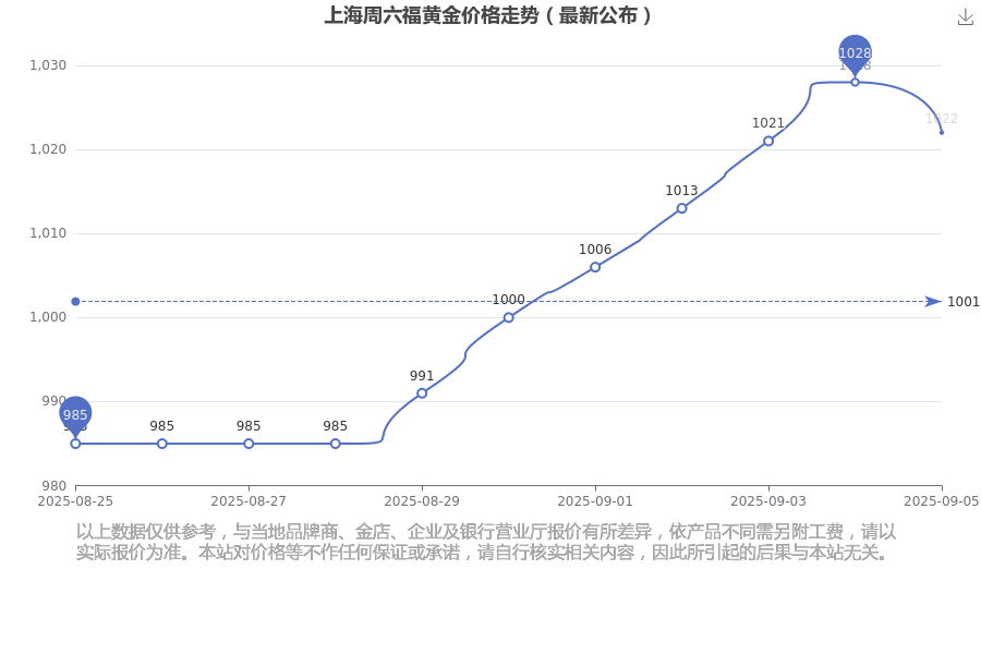 上海周六福黃金價(jià)格現(xiàn)在每克多少錢,今日黃金一克的標(biāo)價(jià)是多少?今日上海周六福黃金價(jià)格查詢,1022.0元/克,這是上海周六福于 2025年9月7日所定的黃金價(jià)格。