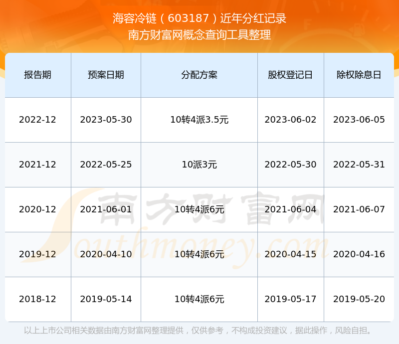 海容冷鏈最新一次公布的分紅方案為10轉(zhuǎn)4派3.5元。本次權(quán)益分派股權(quán)登記日為2023年6月2日,除權(quán)除息日為2023年6月5日,派息日為2023年6月5日。