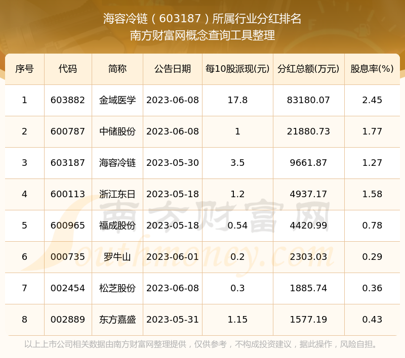 按照南方財(cái)富網(wǎng)趨勢選股系統(tǒng)統(tǒng)計(jì),海容冷鏈所屬行業(yè)為冷鏈物流行業(yè),冷鏈物流行業(yè)分紅排名情況如下表: