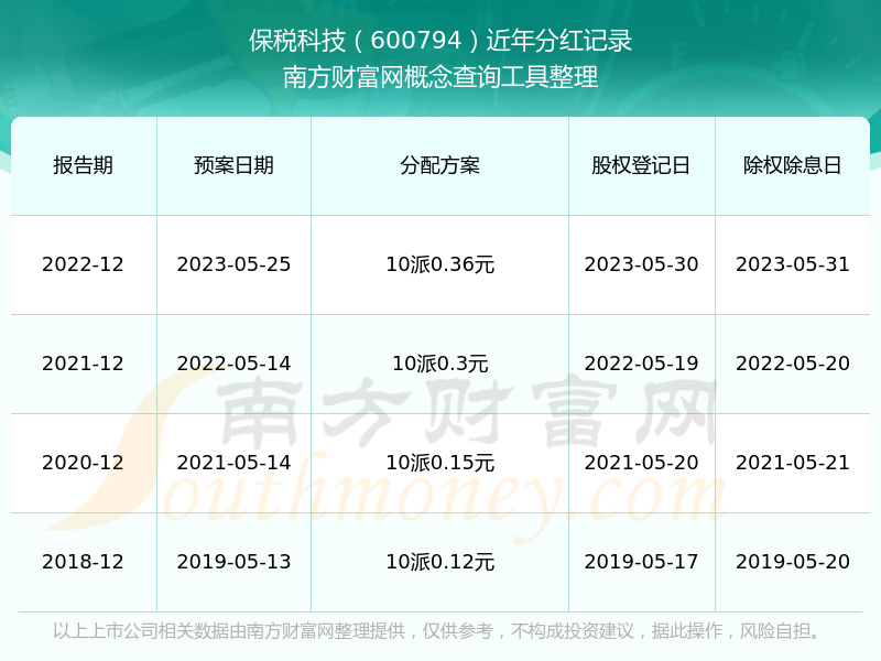 一、保稅科技(600794)股票分紅記錄