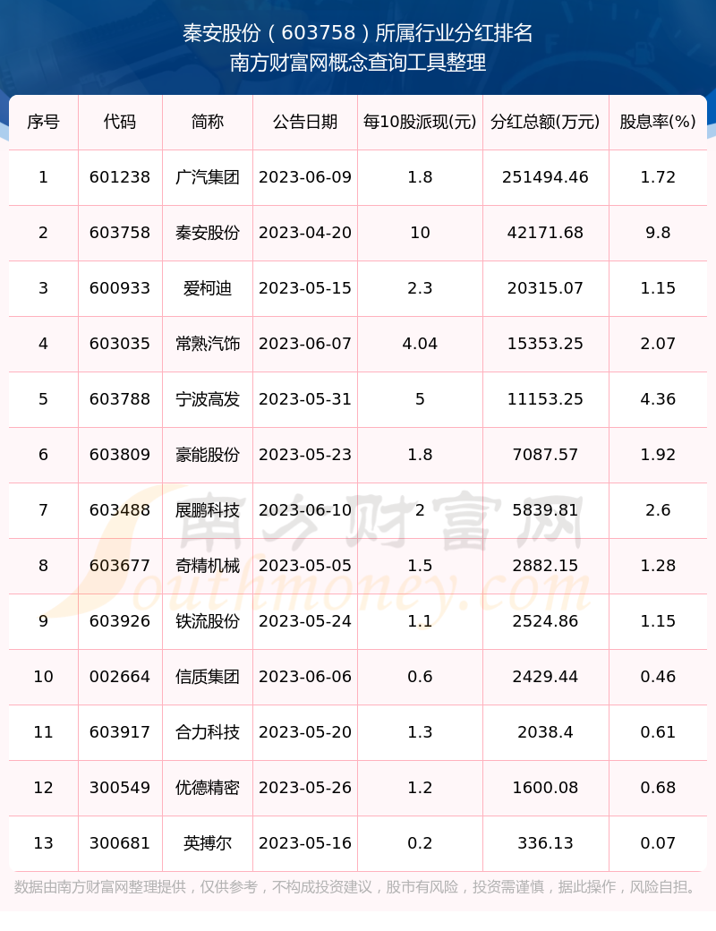 按照南方財(cái)富網(wǎng)趨勢選股系統(tǒng)統(tǒng)計(jì),秦安股份所屬行業(yè)為汽車零部件行業(yè),汽車零部件行業(yè)分紅排名情況如下表: