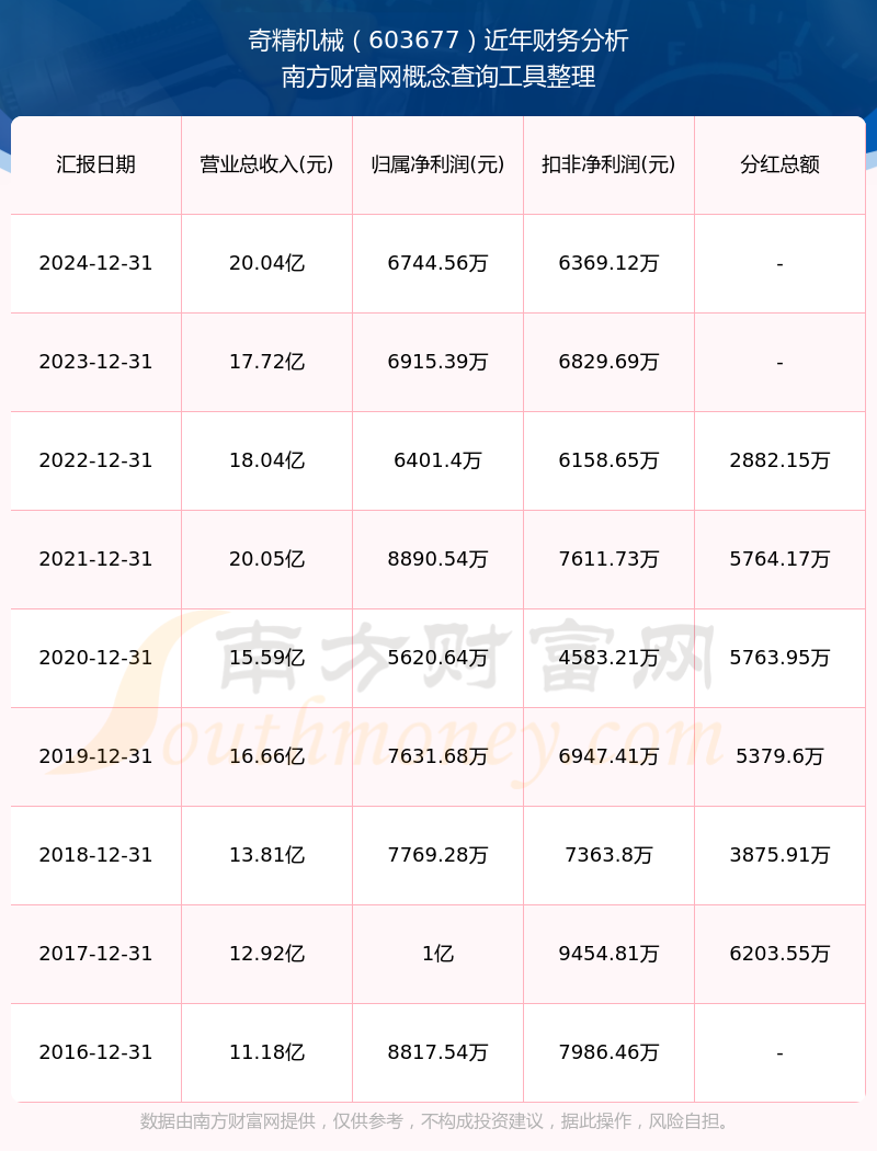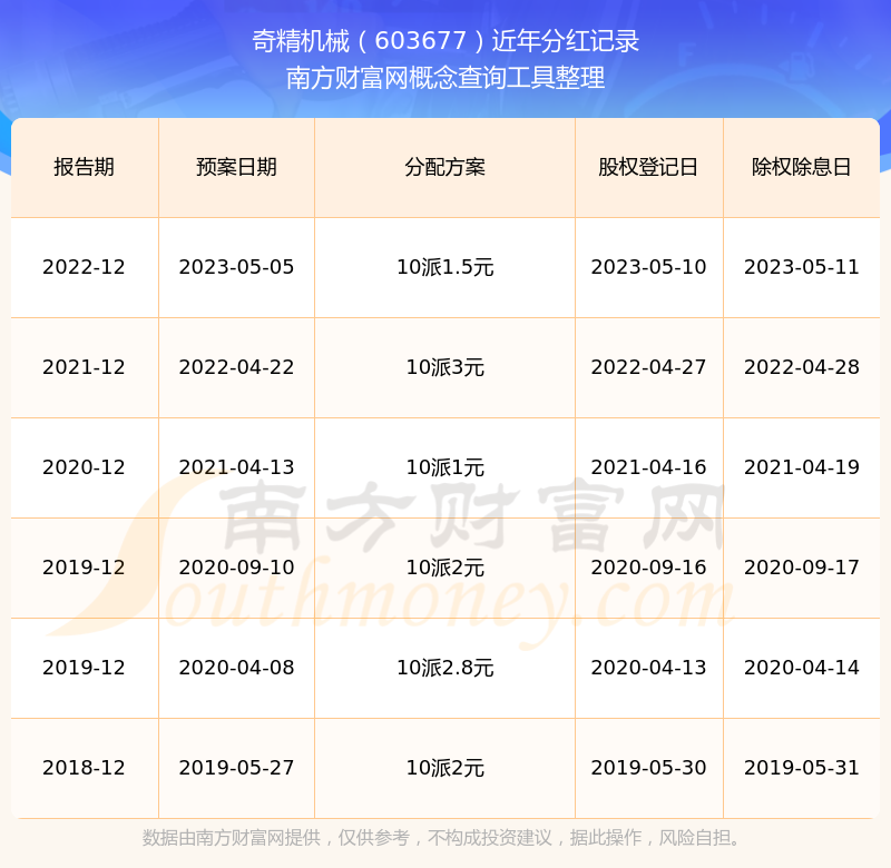 奇精機(jī)械歷年分紅派息情況如下表所示: