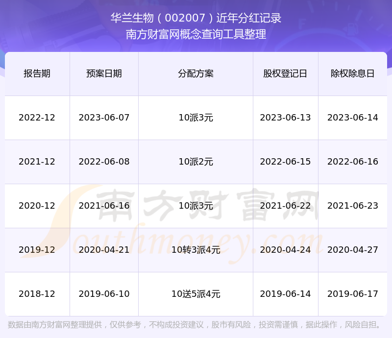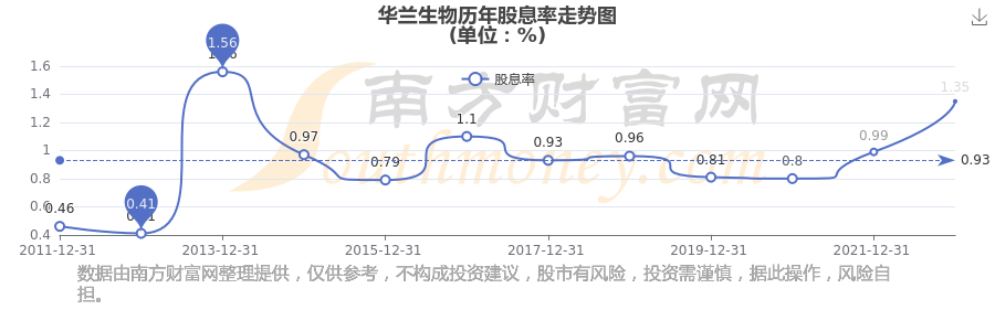 華蘭生物最新一次公布的分紅方案為10派3元。本次權(quán)益分派股權(quán)登記日為2023年6月13日,除權(quán)除息日為2023年6月14日,派息日為2023年6月14日。