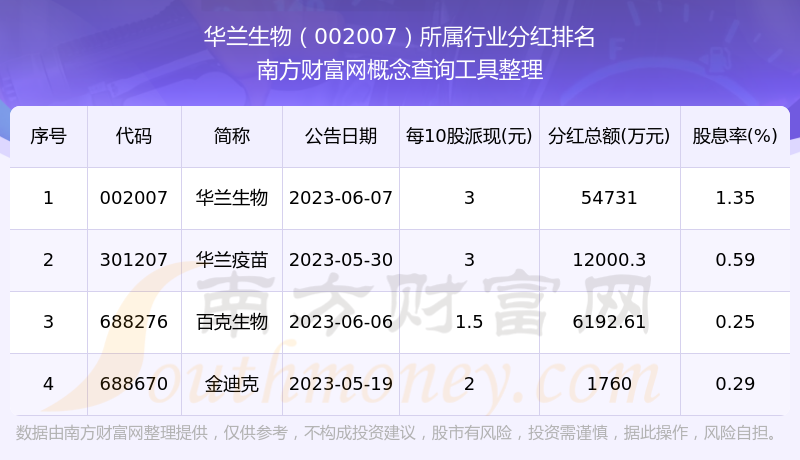 按照南方財富網(wǎng)趨勢選股系統(tǒng)統(tǒng)計,華蘭生物所屬行業(yè)為流感疫苗行業(yè),流感疫苗行業(yè)分紅排名情況如下表: