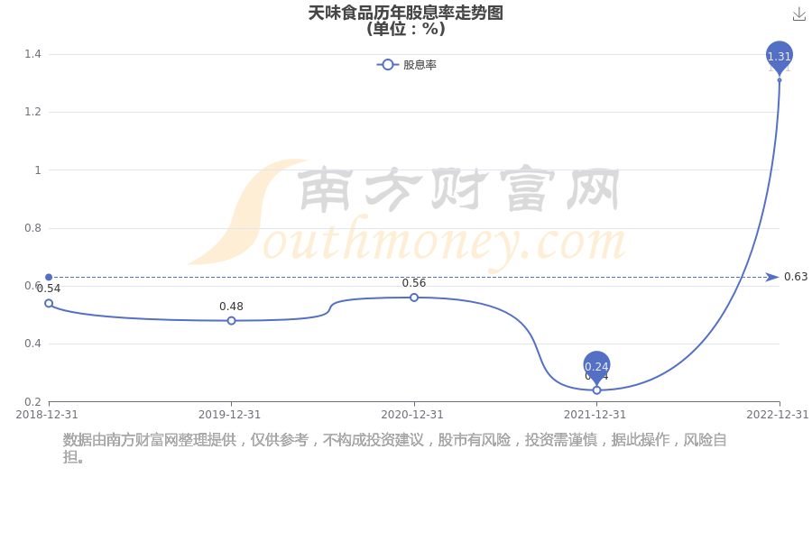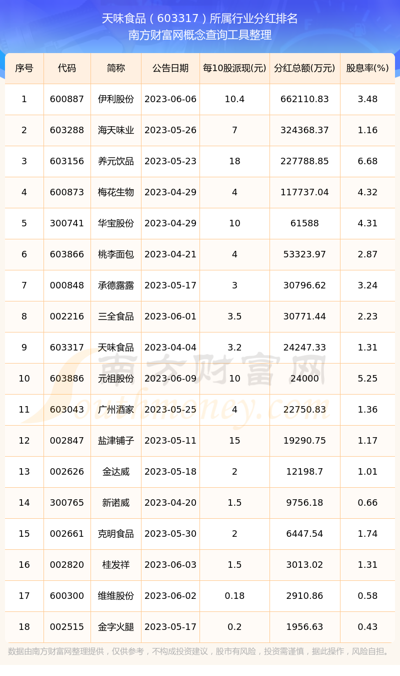 按照南方財(cái)富網(wǎng)趨勢(shì)選股系統(tǒng)統(tǒng)計(jì),天味食品所屬行業(yè)為食品飲料行業(yè),食品飲料行業(yè)分紅排名情況如下表: