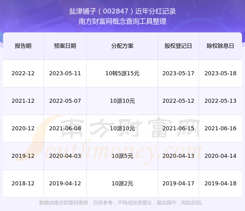 一、鹽津鋪?zhàn)樱?02847)股票分紅記錄