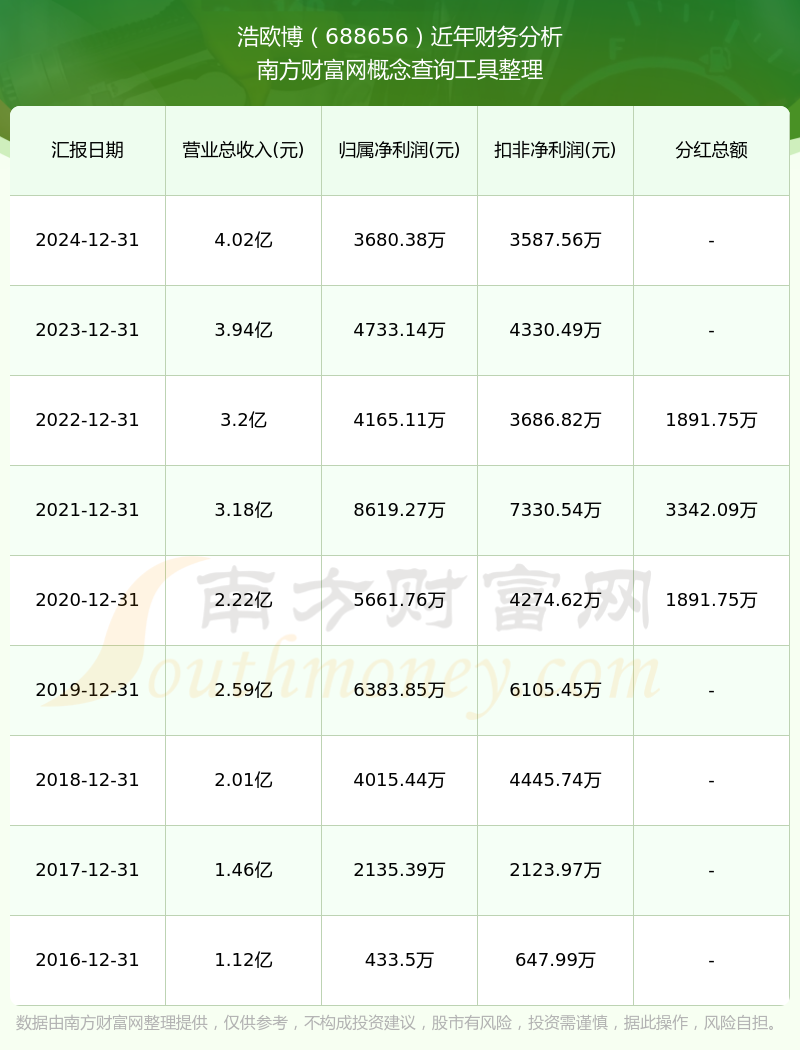 2024年報顯示,浩歐博實(shí)現(xiàn)營收4.02億,同比增長2.01%;凈利潤3680.38萬,同比增長-22.24%;毛利率63.92%。
