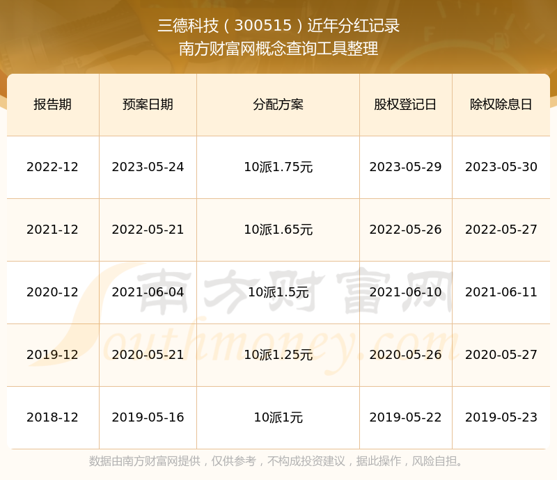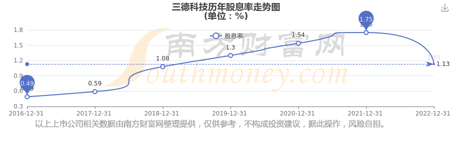三德科技最新一次公布的分紅方案為10派1.75元。本次權(quán)益分派股權(quán)登記日為2023年5月29日,除權(quán)除息日為2023年5月30日,派息日為2023年5月30日。