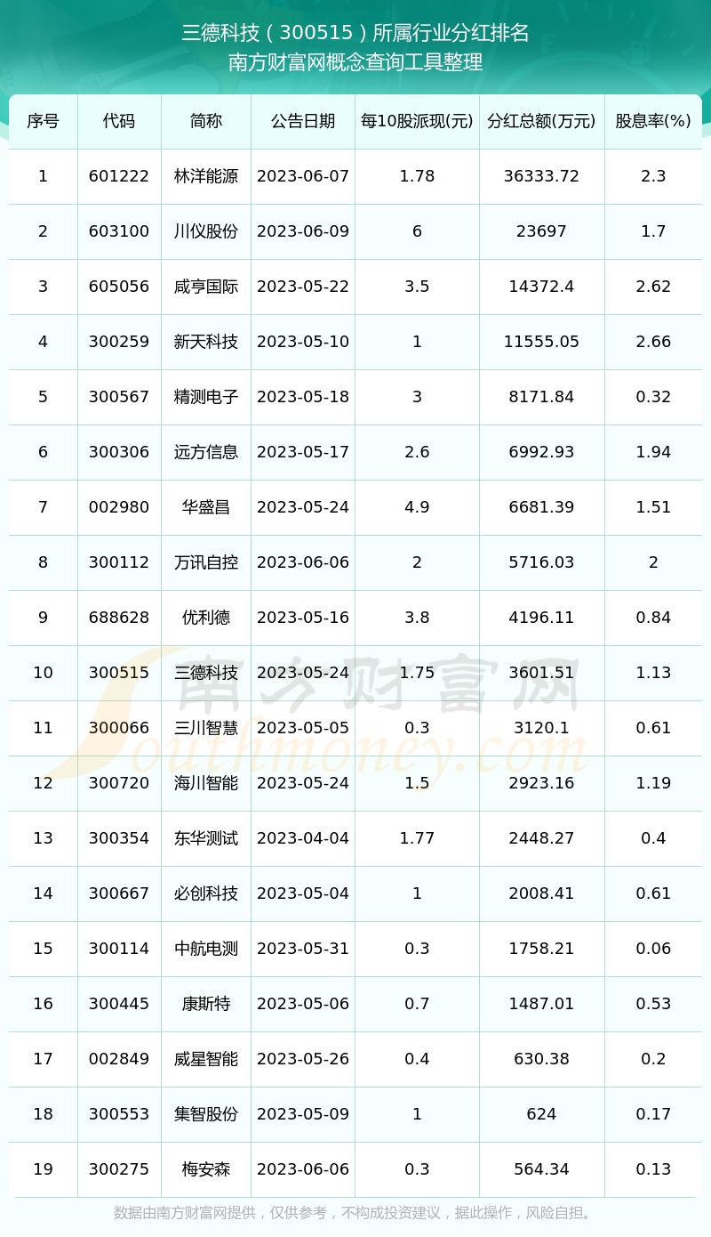 按照南方財(cái)富網(wǎng)趨勢選股系統(tǒng)統(tǒng)計(jì),三德科技所屬行業(yè)為儀器儀表行業(yè),儀器儀表行業(yè)分紅排名情況如下表: