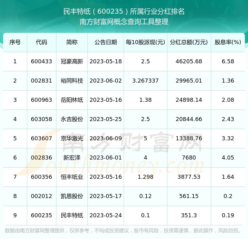 按照南方財(cái)富網(wǎng)趨勢(shì)選股系統(tǒng)統(tǒng)計(jì),民豐特紙所屬行業(yè)為造紙印刷行業(yè),造紙印刷行業(yè)分紅排名情況如下表: