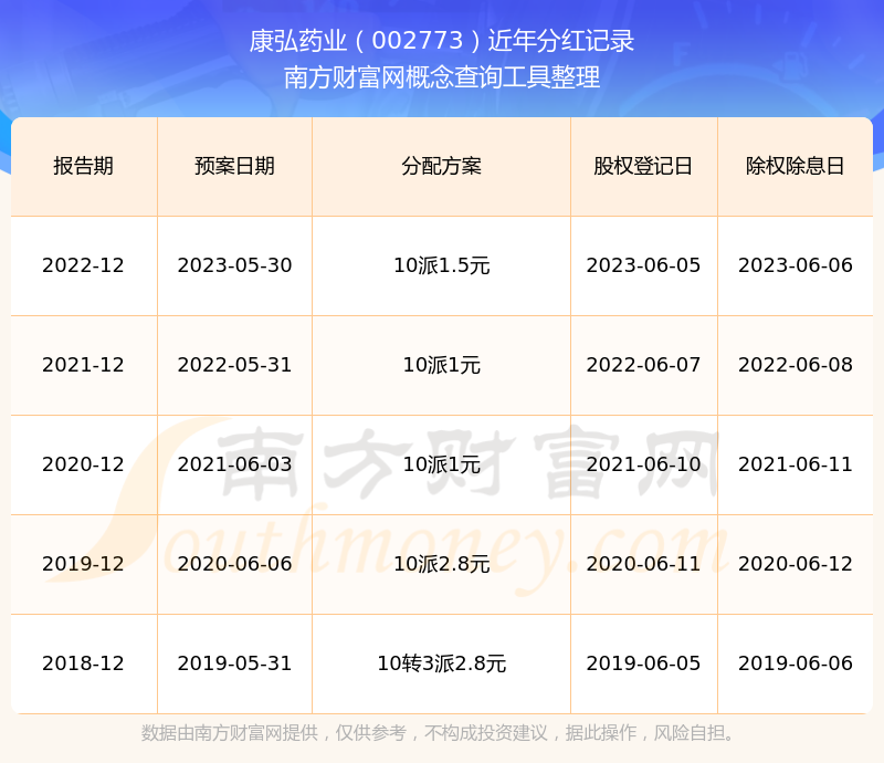 康弘藥業(yè)最新一次公布的分紅方案為10派1.5元。本次權(quán)益分派股權(quán)登記日為2023年6月5日,除權(quán)除息日為2023年6月6日,派息日為2023年6月6日。