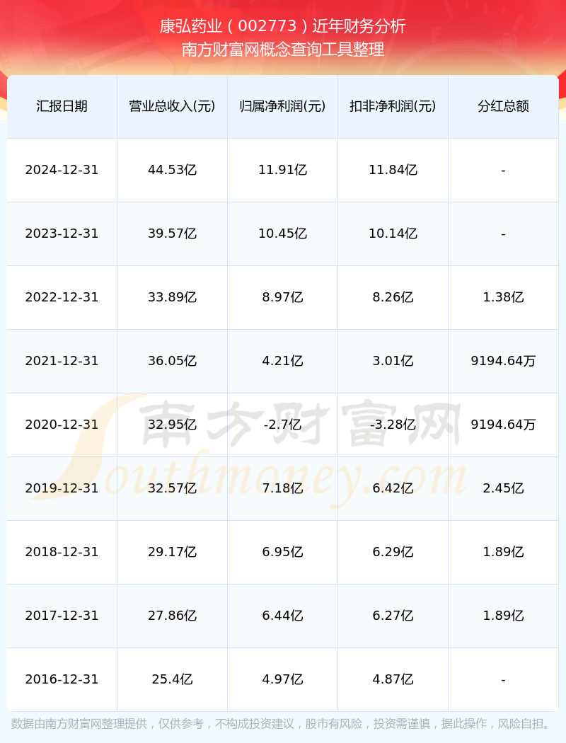 康弘藥業(yè)2024年總營收44.53億,同比增長12.51%;凈利潤11.91億,同比增長14.02%;銷售毛利率89.52%。